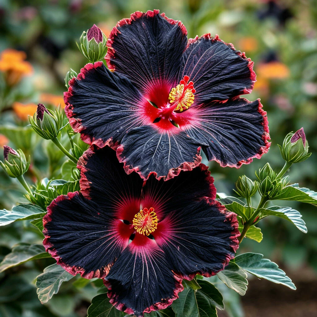 Садовый гибискус «Файер Дэнсер» — это настоящее произведение искусства, которое не оставит равнодушным ни одного ценителя прекрасного. Его крупные, почти чёрные цветки с огненно-красной каймой, словно языки пламени, притягивают взгляд и создают атмосферу загадочности и страсти. Представьте, как этот прекрасный гибискус будет смотреться в вашем саду на фоне зелени, словно таинственный цветок из сказочной страны!