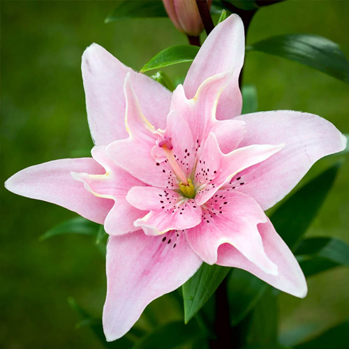 Эта лилия вырастает размером 60 – 90 см. Зацветает она одной из первых. Обычно это происходит с июня по июль. Стебли более короткие по сравнению с другими «сородичами». Благодаря этому многолетник идеально подходит для выращивания в вазонах и небольших садах. Листья темно-зеленые, с глянцевым блеском. Цветки крупные – шириной до 25 см. Они имеют трубчатую форму и обращены вверх. Лепестки окрашены в нежный розовый цвет. Ближе к центру они более насыщенные. Особый шарм цветкам придает темный крап. Аромат едва уловимый.
