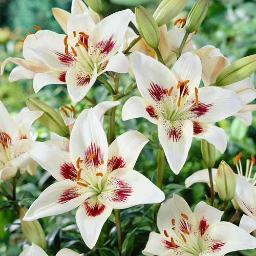 Эти цветки привлекают внимание удивительным окрасом. Лепестки белоснежные, с узором из краповых точек и прямых пурпурных штрихов. При надлежащем уходе куст достигает в высоту 1 м. На каждом стебле формируется по 7 – 9 бутончиков. Период цветения довольно длительный. Ярко-охристые тычинки придают цветкам легкости и кокетства. Лилия источает нежный и ненавязчивый аромат.