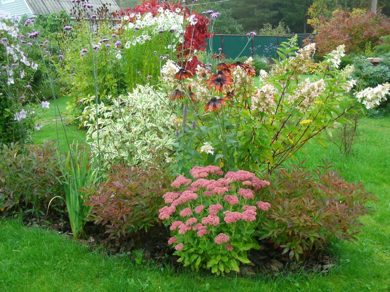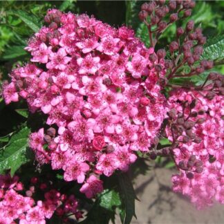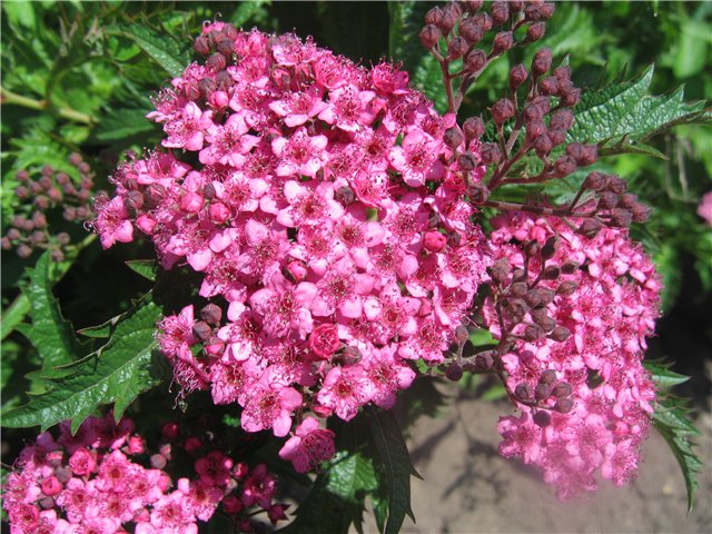 Спирея японская Криспа (Spiraea japonica Crispa) – невысокий кустарник высотой 70-80см и столько же в диаметре. Побеги прямостоячие, иногда изогнутые. Листья зубчатые, волнистые, темно-зелёные, при распускании красноватого цвета, осенью краснеют. Цветки – плоские зонтики, собраны из мелких розово-лиловых цветков, отцветая становятся светлее. Появляются на концах прошлогодних побегов. Цветёт с июля до сентября. Для более продолжительного цветения рекомендуется удаление отцветших соцветий. Светолюбива, к почве нетребовательна, но предпочитает влажные, плодородные, рыхлые почвы. Зимостойка.